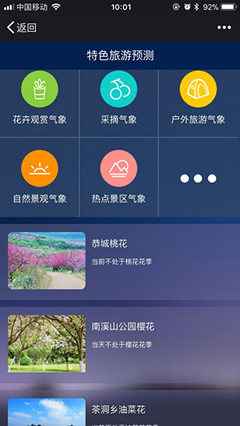 桂林旅游气象微信公众号正是旅游服务平台数据展示和发布的窗口之一。气象微信公众号由主菜单一:缤纷天气、主菜单二:服务热点和主菜单三:互动有礼以及后台预报制作系统四大部分组成。前三部分主要负责展示,第四部分是后台数据实时监测、统计处理与预报系统业务化运行。打开公众号,界面上立即弹出当地实时温度、降水、风速、风向、湿度等天气实况,以及未来三天的天气预报。在缤纷天气菜单栏中,旅游、着装、人体舒适度、交通、体感温度等各项气象指数一目了然,各时段的分钟降水和各景区的实景天气可以随时调出;在旅游推荐菜单栏中,用户可以查询花卉观赏气象、采摘气象、自然景观气象等,里面还包括了最佳旅游路线推荐及沿途的酒店、特色美食推荐,用户还可以自主定制景区天气。